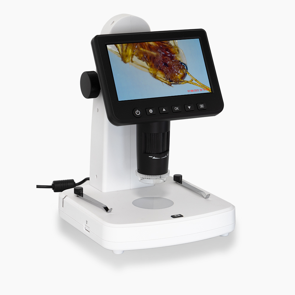 Il microscopio è dotato di uno schermo LCD incorporato e una fotocamera da 5MP che permette di scattare foto e girare video attraverso l’utilizzo dei pulsanti di controllo posizionati al di sotto dello schermo.